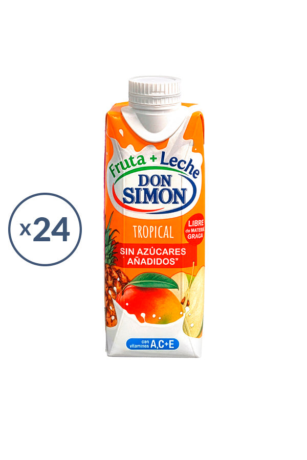 Fruta+leche Tropical Don Simón. Elaborado con piña, uva, mango, manzana y leche desnatada. Sin azúcares añadidos y rico en vitaminas A,C y E.